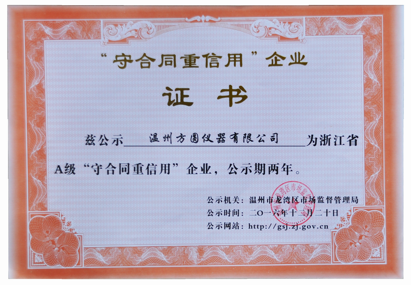 熱烈慶祝溫州方圓儀器有限公司獲得守合同重信譽(yù)企業(yè)證書